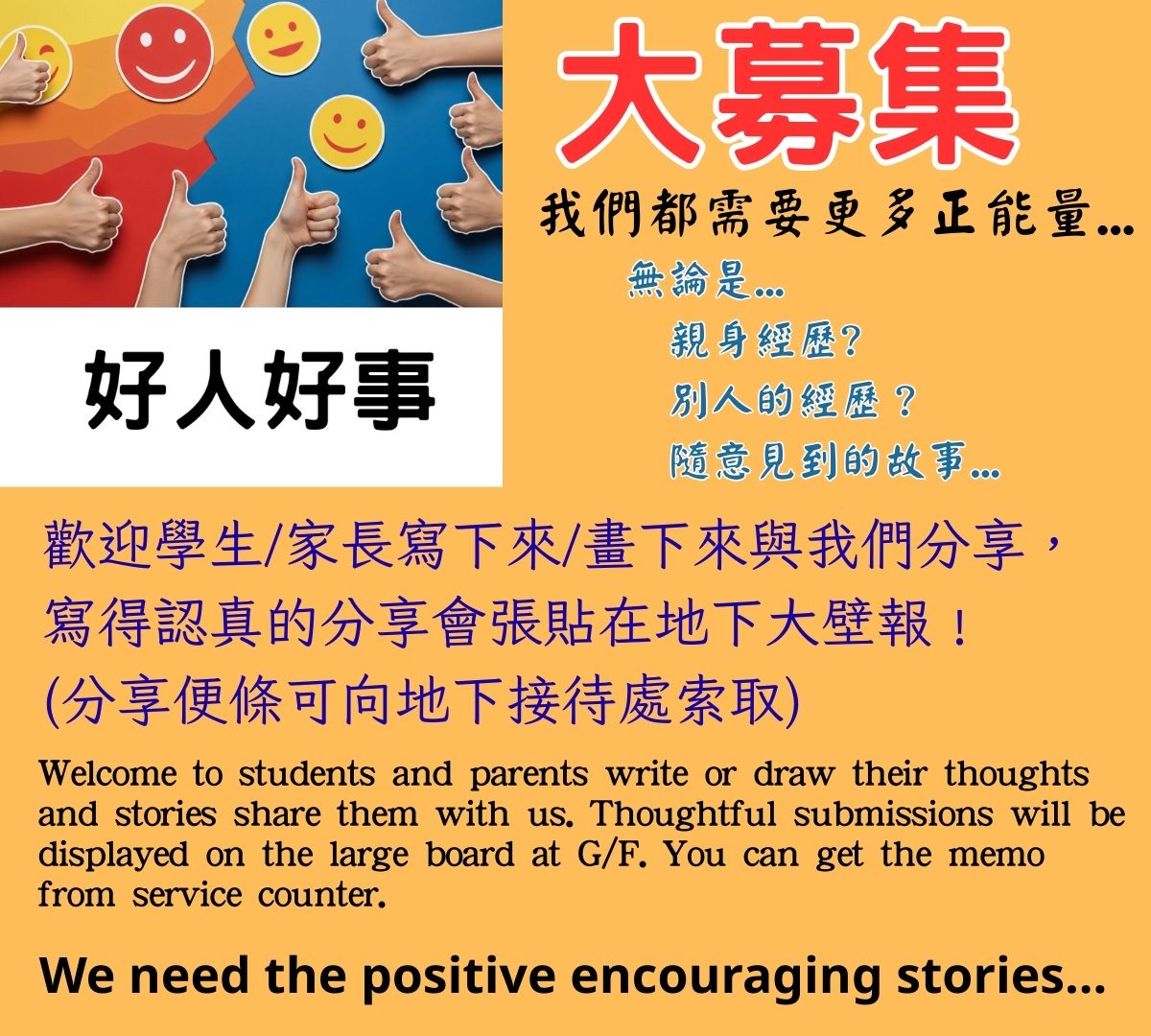 你身邊有默默行善的同學、老師,或熱心助人的鄰居嗎?歡迎學生和家長將這些溫暖人心的故事寫下來或畫出來,與我們分享!每一個善舉都值得被看見,讓正能量傳遞開來,一起營造互助互愛的校園與社區!投稿可於服務櫃檯領取便條紙,優秀分享將張貼於地下大壁報,讓善行被更多人看見!